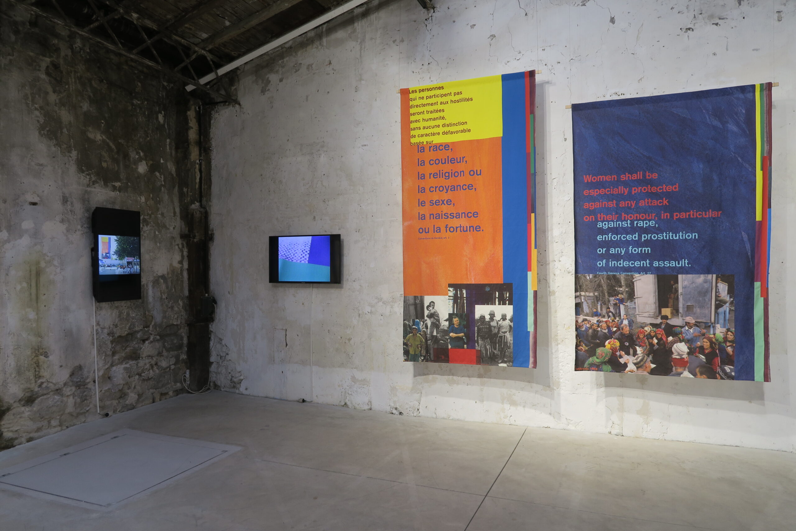 Le fruit de ce travail est un montage de textes et de photos, conçu à la fois comme un reflet et une confrontation, illustrant l’idéal du droit international humanitaire face aux détresses engendrées par les conflits passés ou actuels.