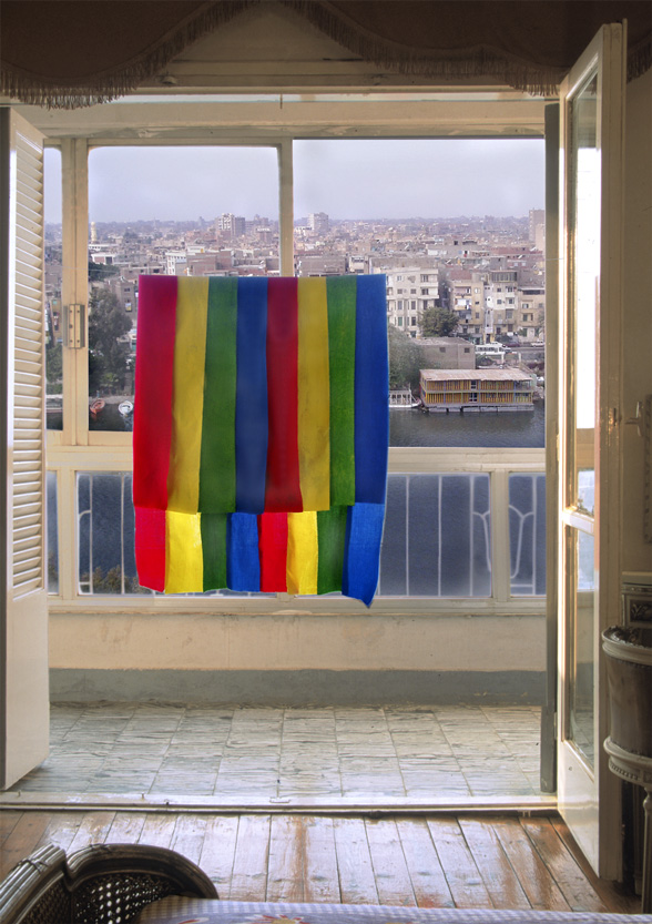 Terrasse. Bandes de tissu reprenant les couleurs d’une baraque flottante sur le Nil.