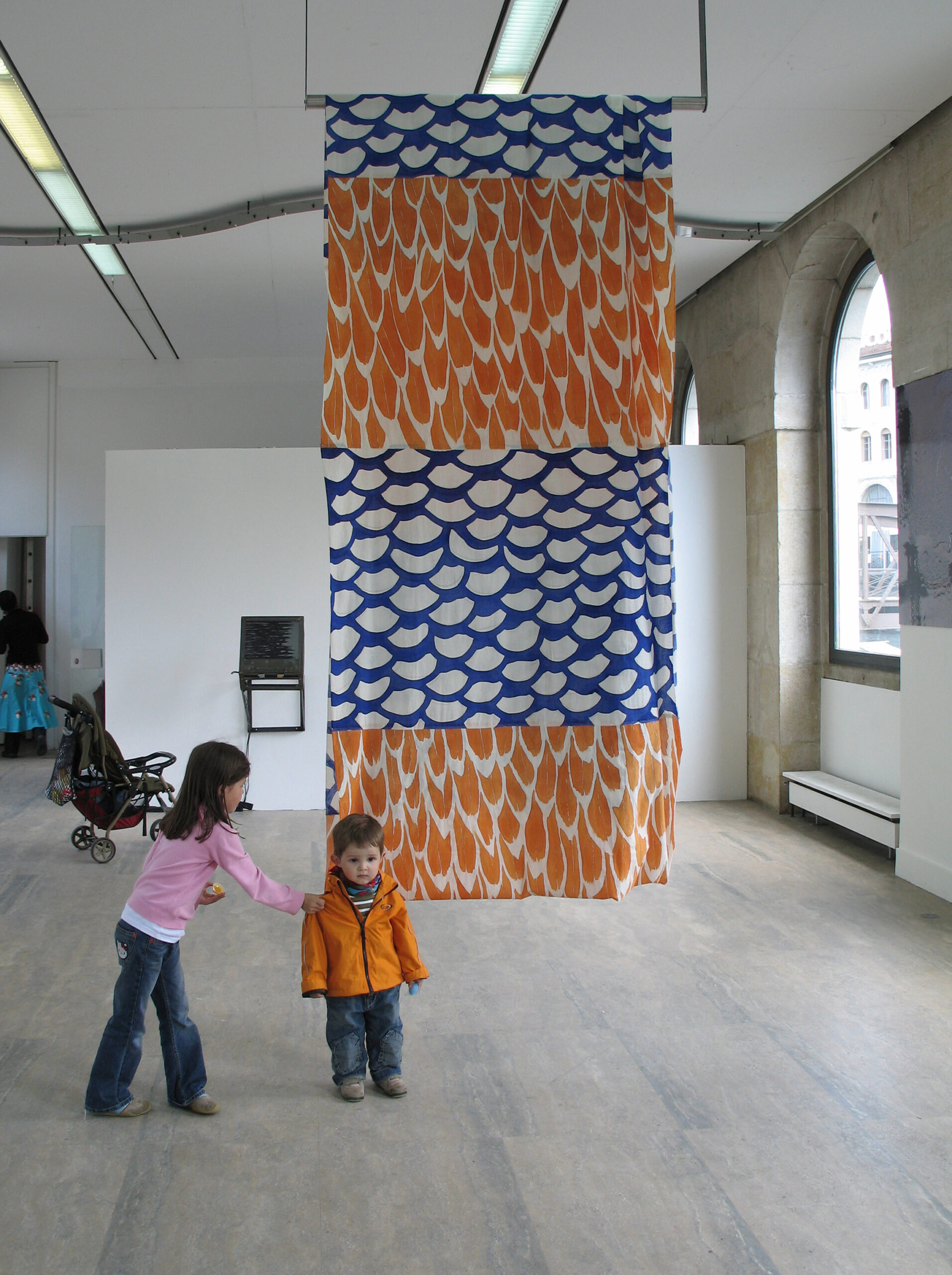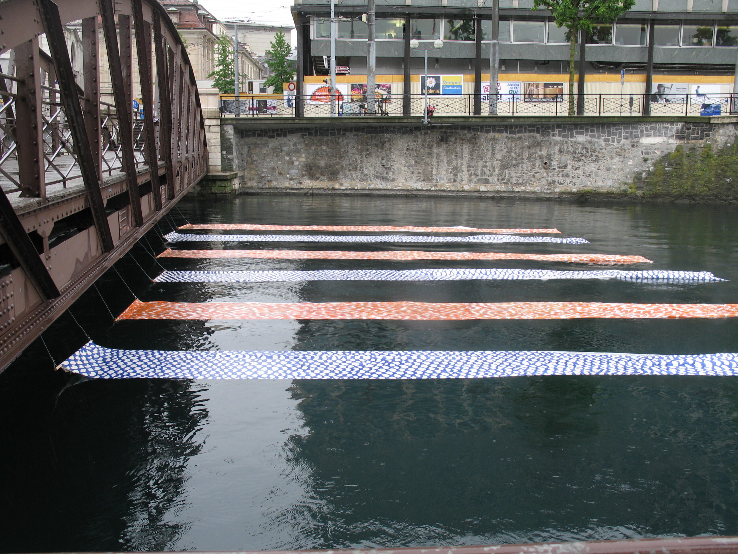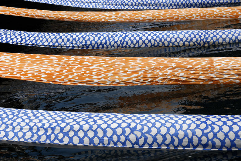 6 lés de tissus peints, flottant à la surface de l’eau et, en alternance, des écailles représentant les poissons, nageant dans l’eau et les plumes, les oiseaux, volant dans le ciel).                                                                      Les bandes de tissu soulignent la surface de l’eau, frontière qui délimite ces deux éléments.