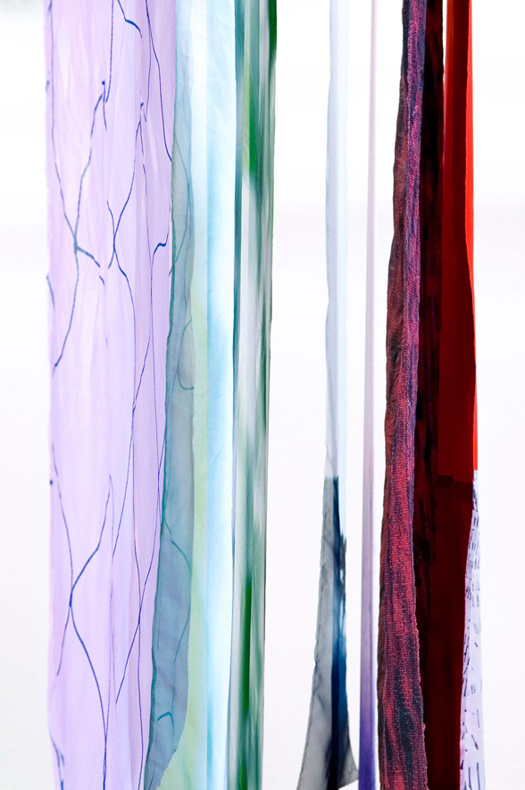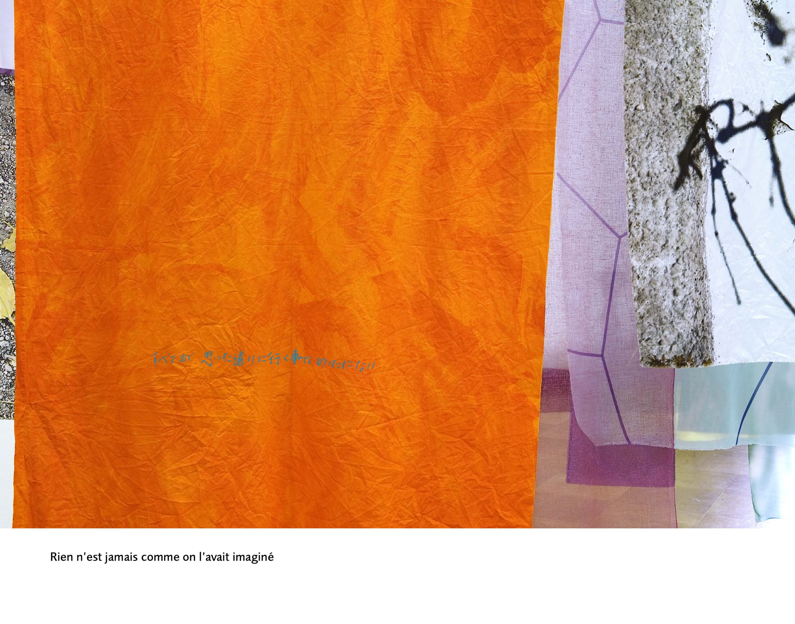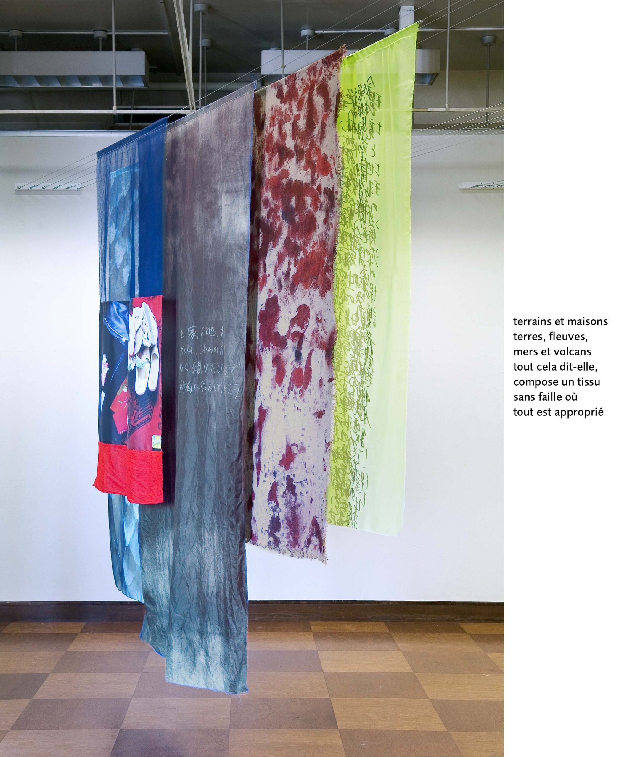 Un pan joue le rôle de charnière au milieu de 6 autres tissus qui s’échelonnent par 3 de chaque côté, chaque élément est recto-verso