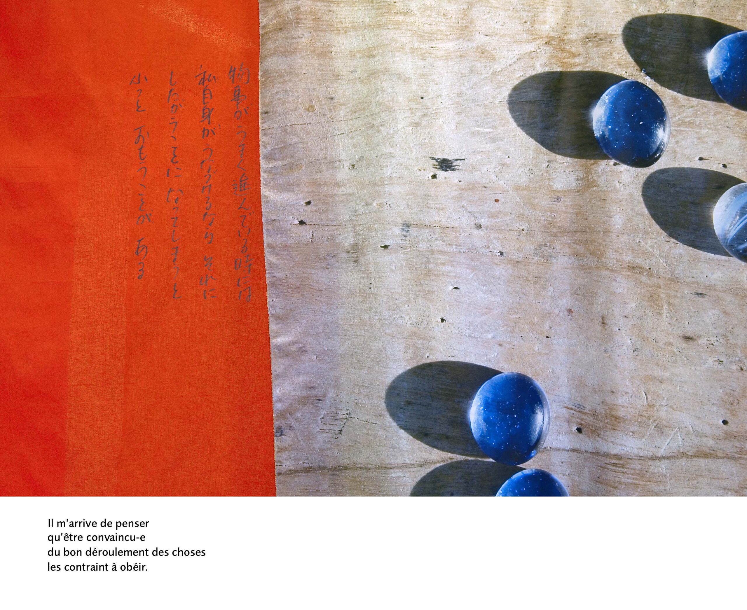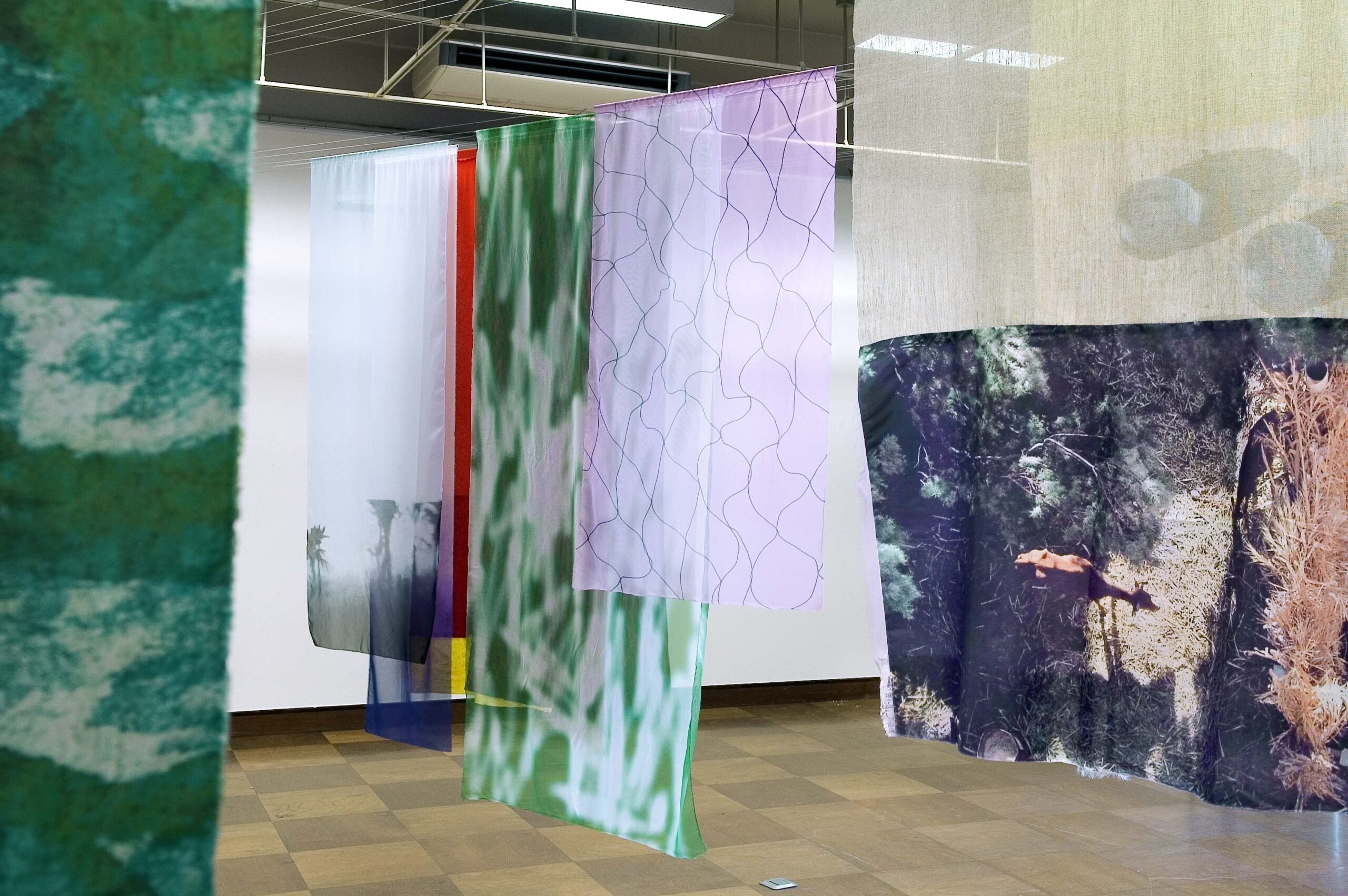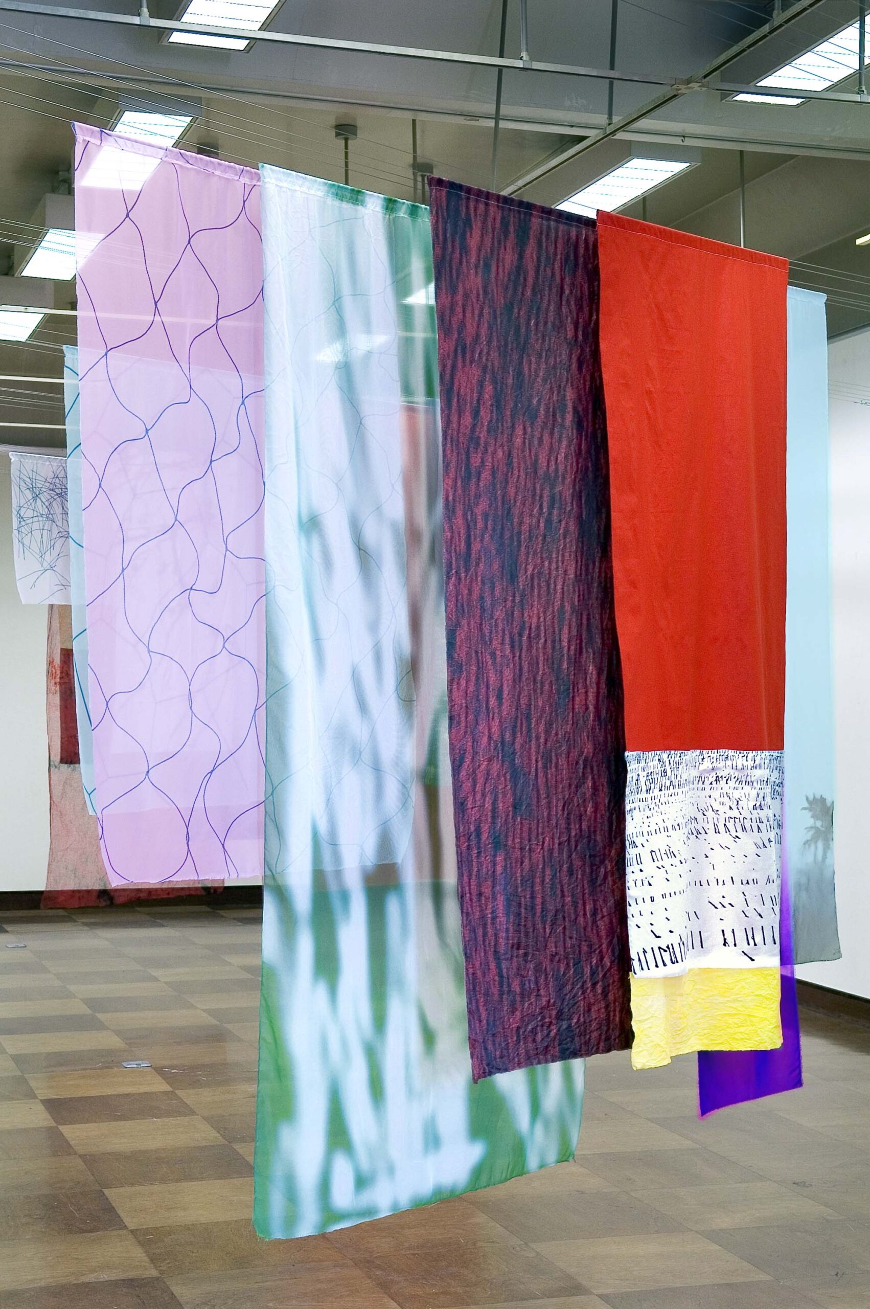 Un pan joue le rôle de charnière au milieu de 6 autres tissus qui s’échelonnent par 3 de chaque côté, chaque élément est recto-verso